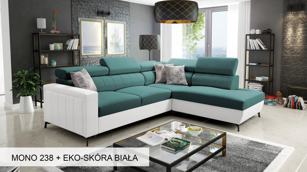 This exquisite corner sofa is available in your chosen high-quality fabric, ensuring a perfect match for your interior. Please note that this model cannot be made entirely of eco-leather, and we focus on providing a premium fabric-only upholstery experience. We offer a selection of fabrics with advanced features such as Teflon coating, which limits liquid absorption and simplifies cleaning. Other fabrics are specifically designed to limit liquid absorption, and a range of PetProof fabrics are available, reinforced to resist snagging from pet claws, ensuring your sofa remains pristine.