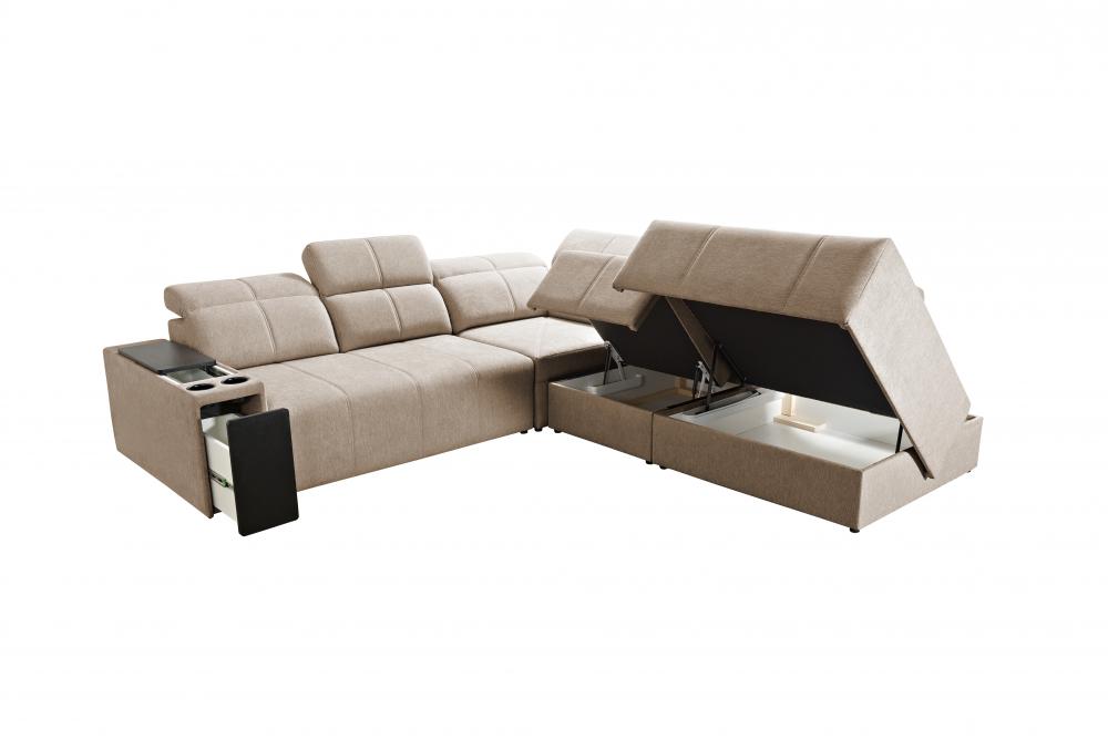 Designed for convenience, this large corner sofa incorporates two spacious bedding containers, providing ample storage for linens or other household items. Stay refreshed with the integrated cup holder and utilize the two practical opening bars, perfect for keeping drinks and essentials close at hand. Decorative cushions shown in the photo are included.