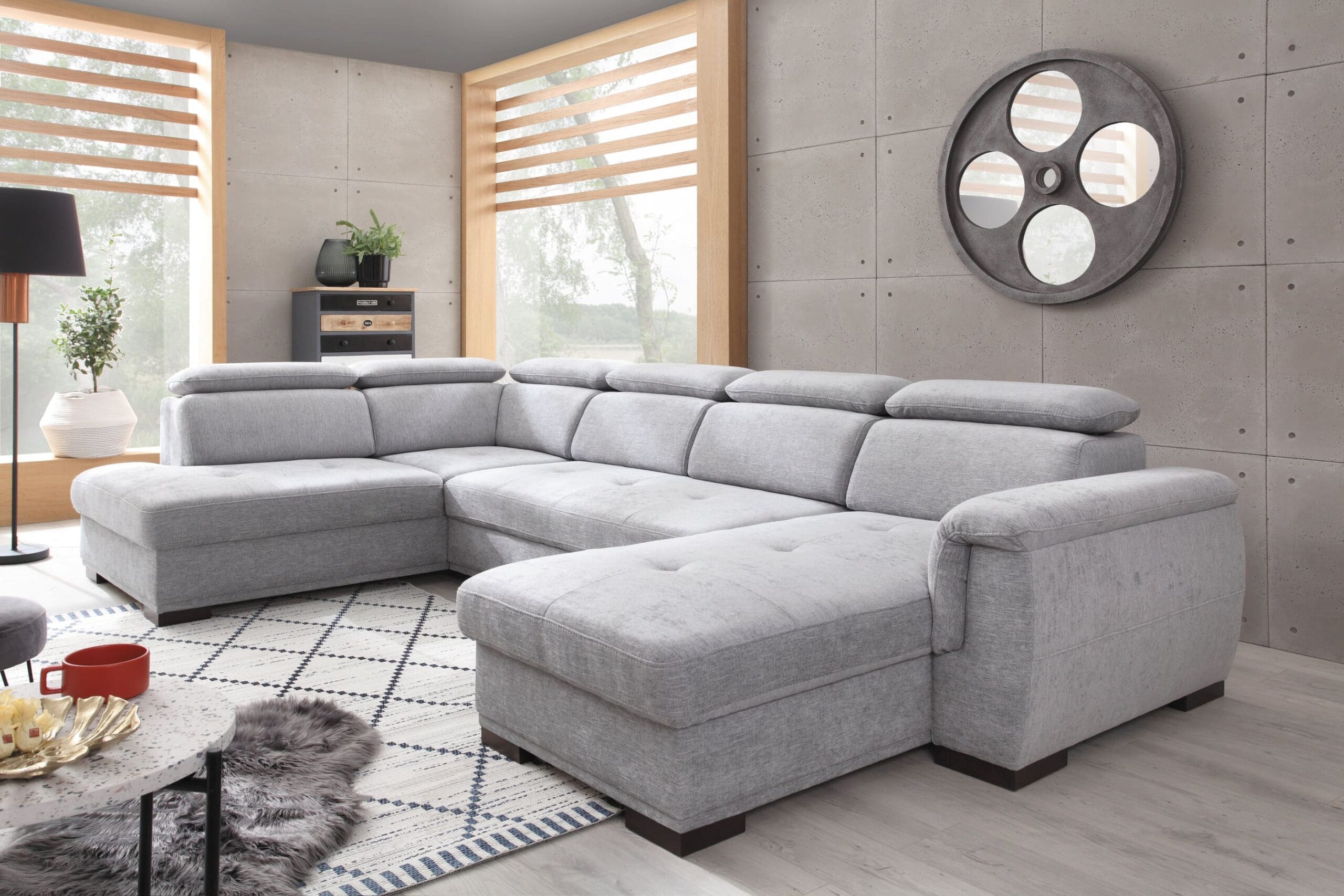 The Umbria I Corner Sofa Bed combines expansive seating with a clean, modern aesthetic—perfect for larger living rooms that demand both function and form. Featuring high-resilience (HR) foam in the seat, backrest, and adjustable headrests, this sofa ensures lasting comfort and support for the whole family.
